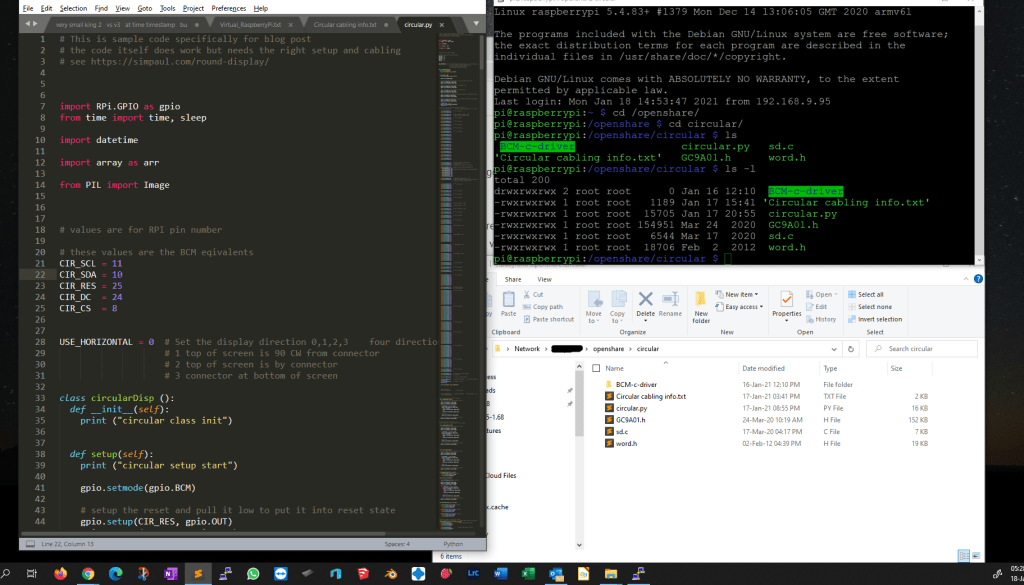 For example edit the circular.py file in Sublime text on the PC, save the file (Ctrl S) and open the SSH to the Pi (if not already open) and you can run it. If there are errors, you see them in the SSH window and can edit and correct them in the PC editor.